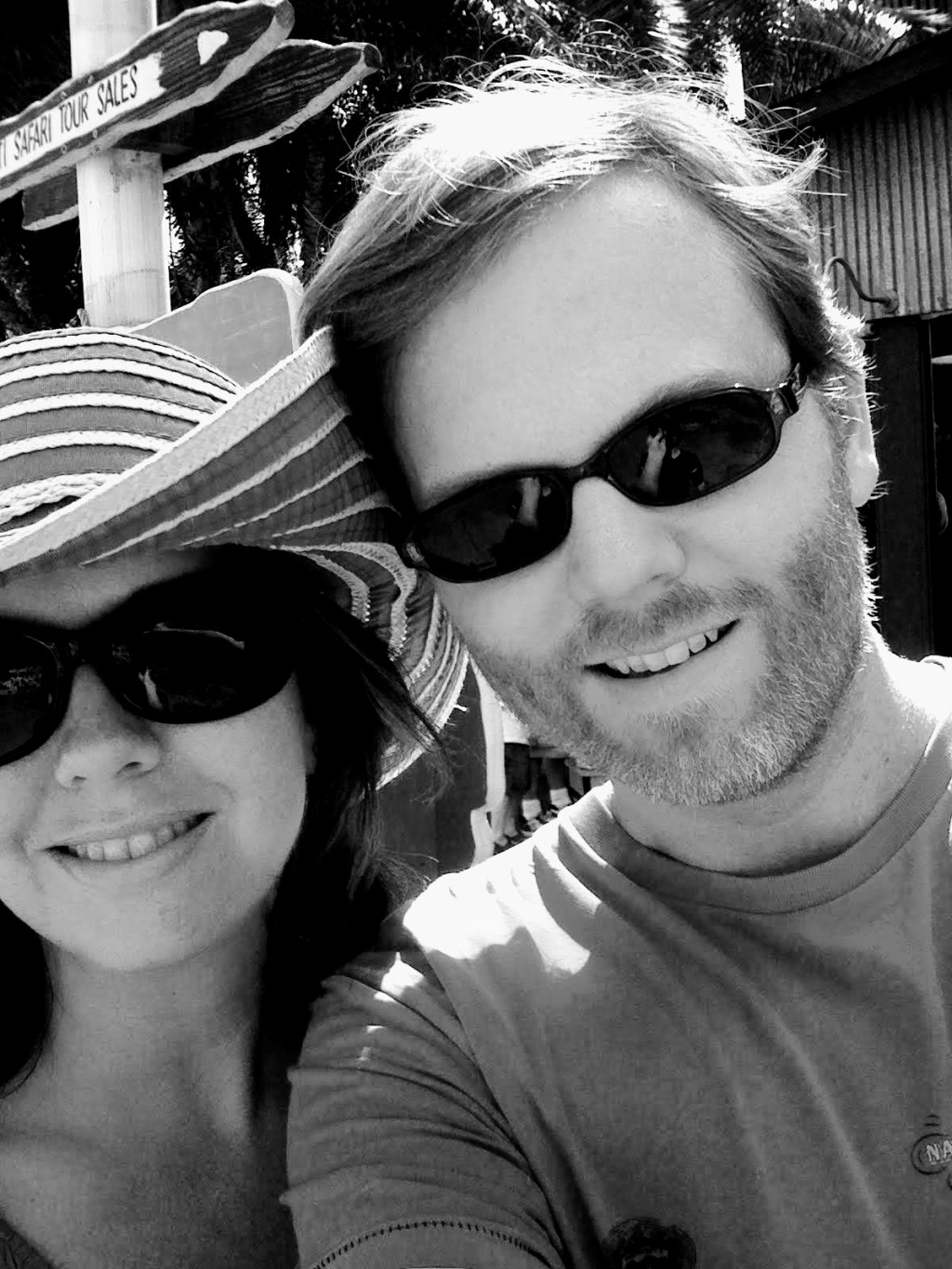 And in this picture, pinned in the middle the collage, and which I later dated to the spring of 2009, her eyes are hidden behind sunglasses. As was often the case in photos, most frequently oversized Jackie O’s. But it was a bright sunny summer day, and I’m sure I took this as an impulsive “couple selfie” of the two of us as we strolled through the amusement park. No time to shed our sunnies. Mine are green rimmed and too small for my broad face. I distinctly remember hastily grabbing these from a bowl on a side table as I rushed out the door that morning.